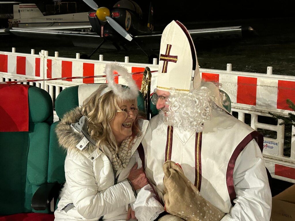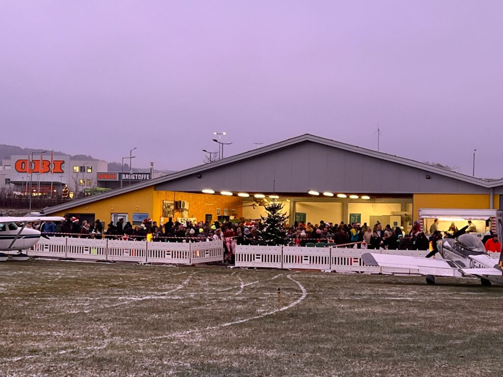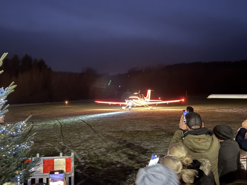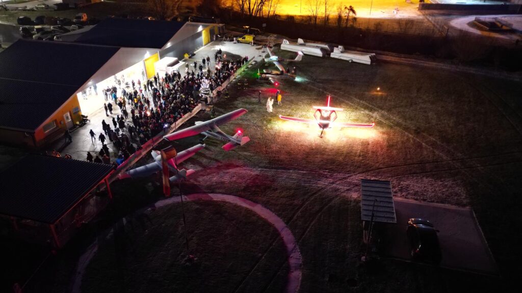 Pünktlich um 17 Uhr landete der Nikolaus in einem festlich geschmückten Flugzeug auf dem Flugplatz. Die Ankunft sorgte für große Begeisterung bei den kleinen Gästen, die ihn aufgeregt von der Abstellfläche aus beobachteten. Nachdem das Flugzeug sicher zur Abstellfläche gerollt war, stiegen der Nikolaus und das “Christkinderhaus” aus, um den Kindern eine ganz besondere Freude zu bereiten.