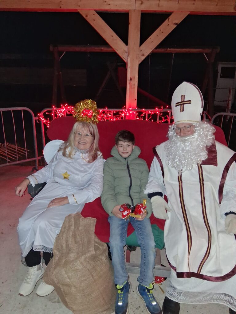 Pünktlich mit Einbruch der Nacht rollte der Nikolaus in einem bunt geschmückten Flugzeug die Landbahn entlang. Viele Augen folgten der festlich geschmückten Maschine bis diese vor dem Hangar parkte und den Nikolaus un sein helfendes Engelchen als Fluggäste aussteigen liess. Unter dem Vordach nahmen beide auf roten Stühlen Platz und verteilten die mitgebrachten Nikolaussackerln an die wartenden jungen und älteren Kinder. Diesmal war auch Platz und Zeit für ein gemeinsames Foto.